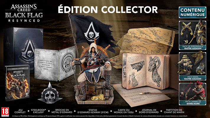 - Edition Collector – Inclut tout le contenu de l’édition Deluxe, ainsi que des objets de collection premium : une figurine d’Edward Kenway, une broche en métal d’Edward, un boitier SteelBook exclusif, une carte du monde en tissu, et bien plus encore.