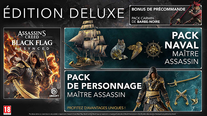 Par ailleurs, les joueurs qui précommanderont Assassin’s Creed Black Flag Resynced recevront le pack Carmin de Barbe-Noire comprenant une tenue exclusive pour Edward Kenway, une paire de sabres, ainsi qu’un ensemble de pistolets. Les éditions Standard, Deluxe et Collector ont également été annoncées.