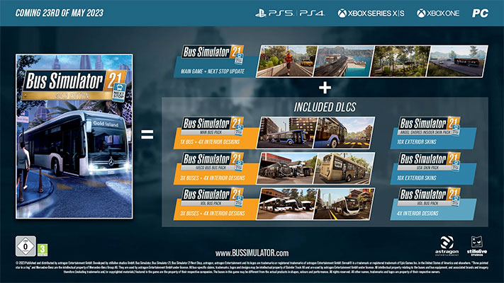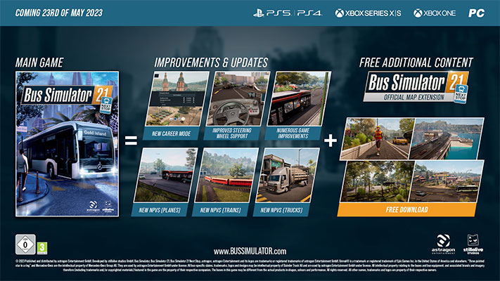 La mise à jour Bus Simulator 21 Next Stop ainsi que les versions PlayStation 5 et Xbox Series X|S, les versions PC pour le Microsoft Store et l’Epic Games Store, l’extension de carte officielle et l’Édition Gold de Bus Simulator 21 Next Stop seront disponibles dès le 23 mai 2023.