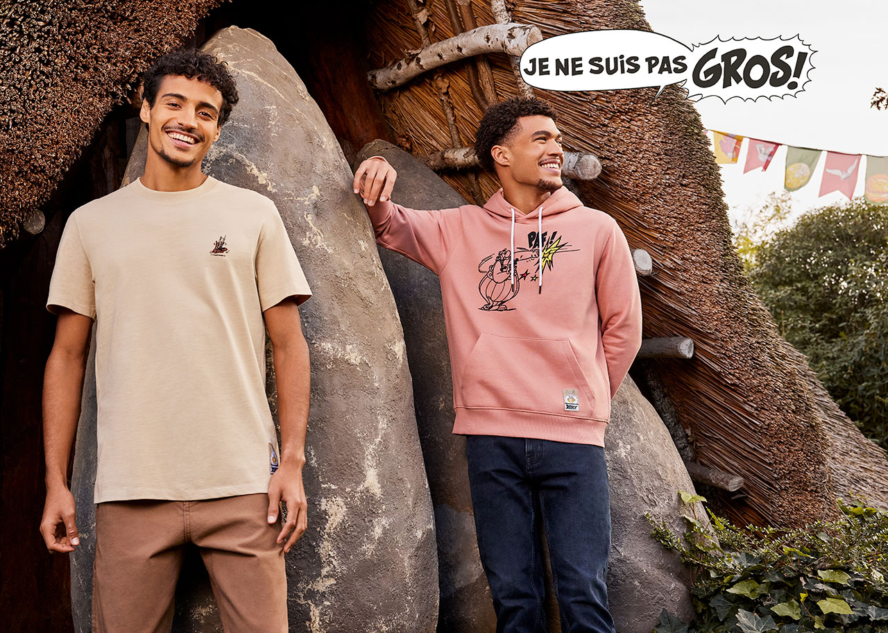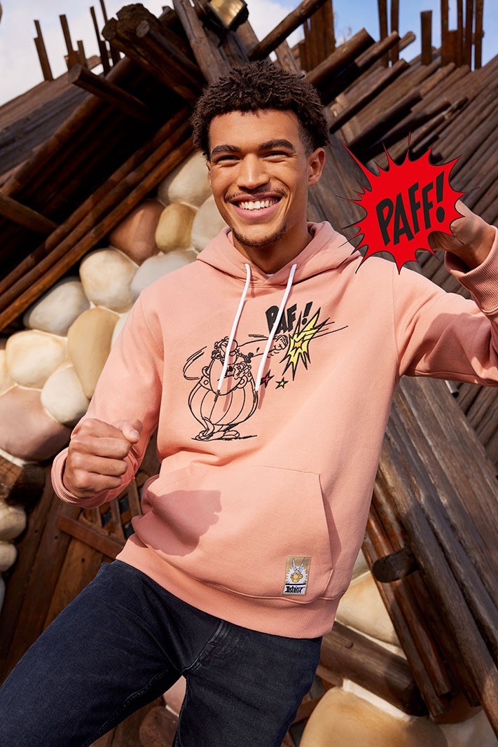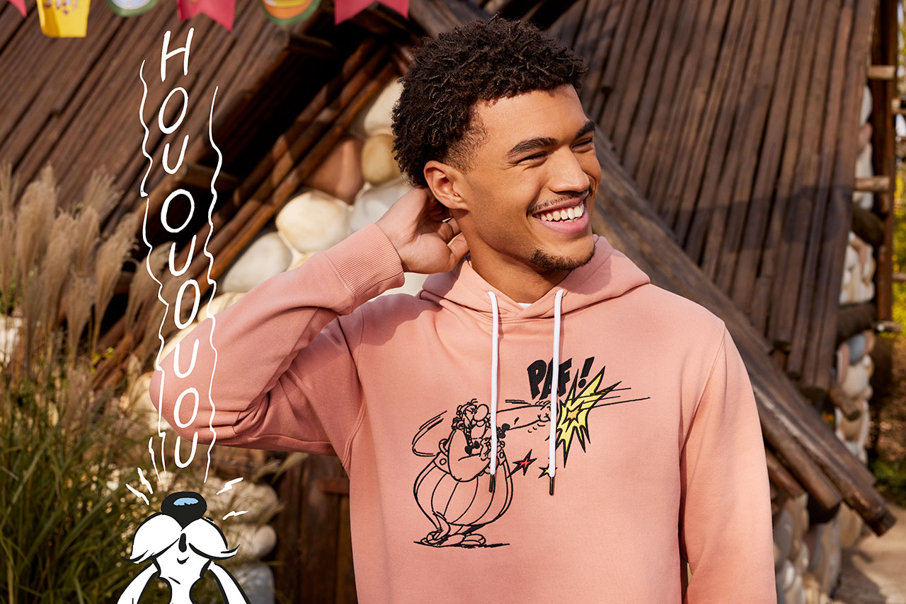 La collection comprend également des pièces plus cosy pour bouquiner pépère sur son canapé, avec une série de sweats à capuche (39,99€) mettant en scène Idéfix et Obélix en pleine action.