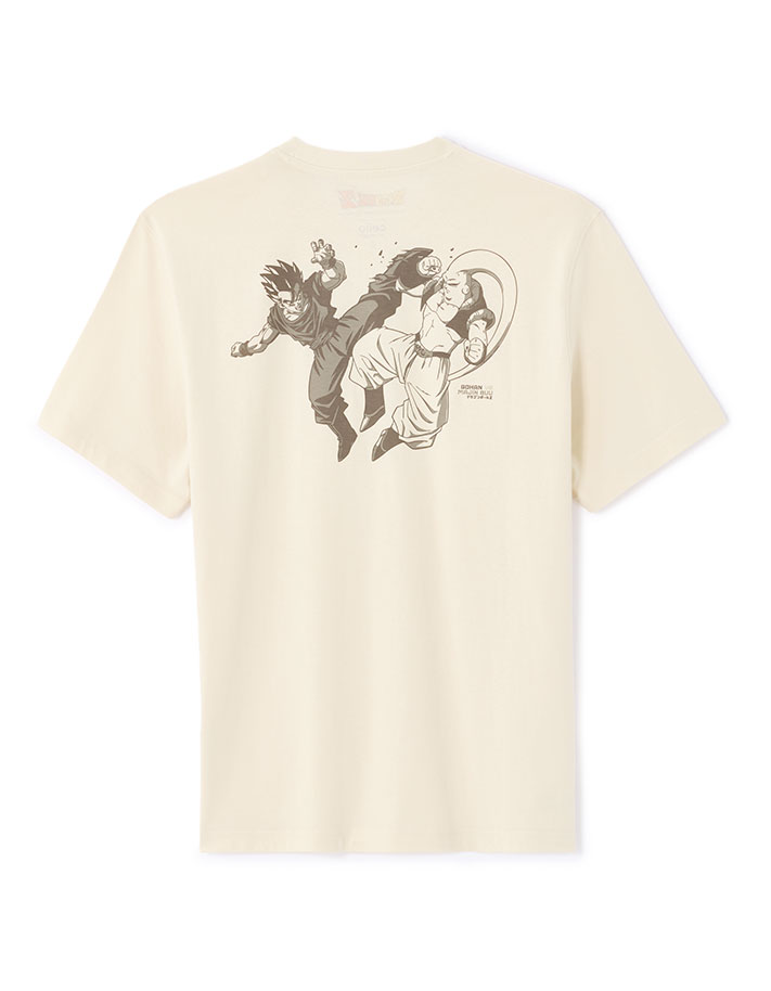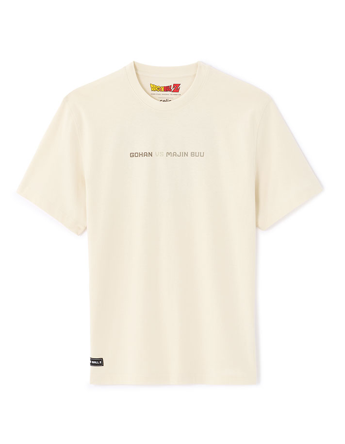 Ce T-shirt beige est habillé de l’inscription Gohan vs Majin Buu à l’avant. L’affrontement prend vie à l’arrière à l’aide d’une illustration représentant Gohan et Majin Buu en plein combat.