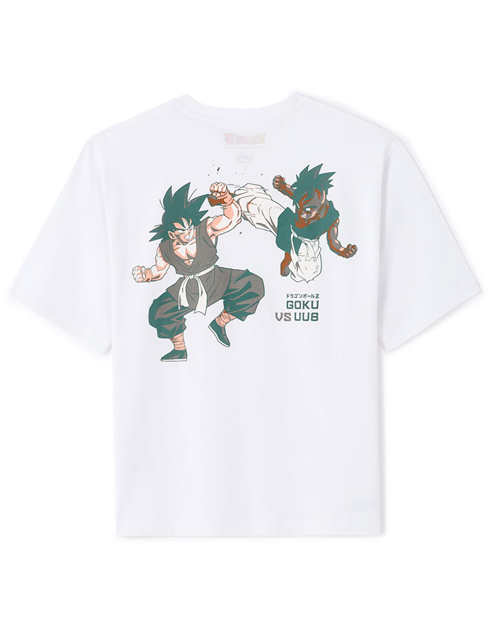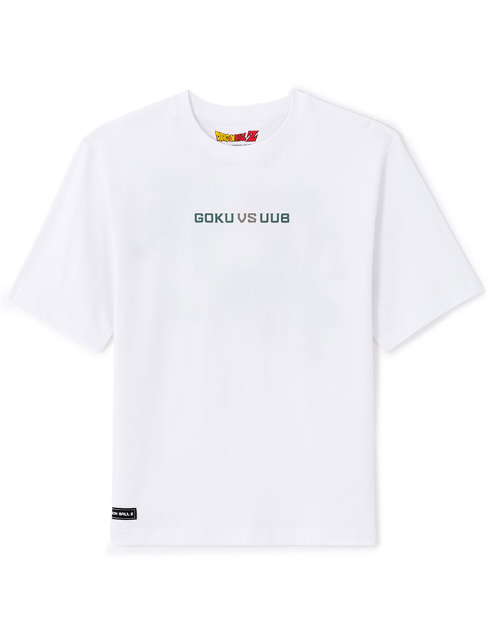 Semblant presque répondre au T-shirt précédent, ce T-shirt blanc est marqué de l’inscription « Goku vs Uub ». Encore une fois, les deux personnages sont en plein combat à l’arrière de la pièce.