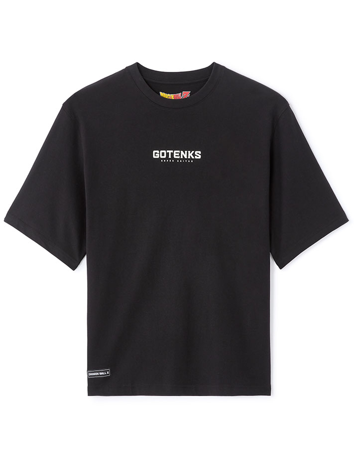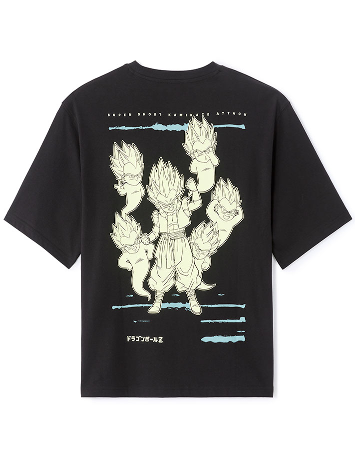 Ce T-shirt noir met Gotenks à l’honneur. Son nom est affiché à l’avant de la pièce, tandis que la fusion de Goten et Trunks occupe tout le dos. Son attaque signature, le « Super Ghost Kamikaze Attack » lui permet d’invoquer des fantômes à son effigie qui l’accompagnent ici !