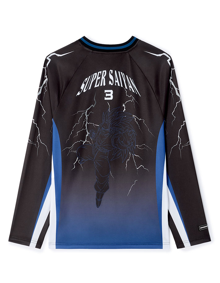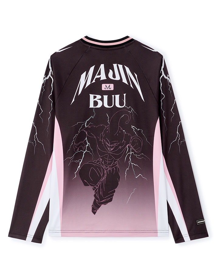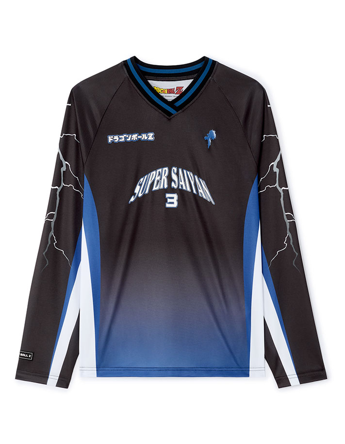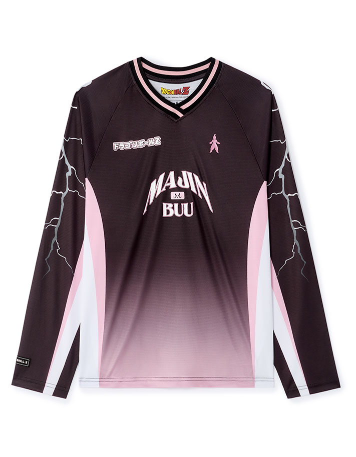 Deux maillots de foot à manches longues sont proposés. L’un rose aux couleurs de Majin Buu (1), et l’autre bleu aux couleurs du Super Saiyan 3 de Goku (2). Les deux sont décorés d’éclairs, de l’inscription Majin Buu ou Super Saiyan 3 d’une broderie à l’avant, et d’une illustration du personnage dans le dos accompagnée de la même inscription à l’arrière.