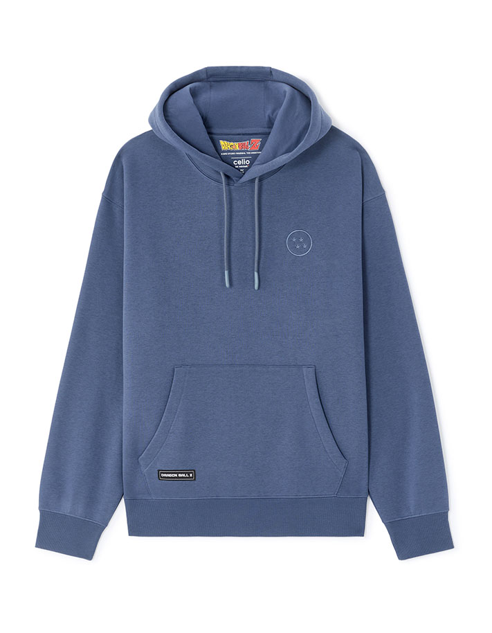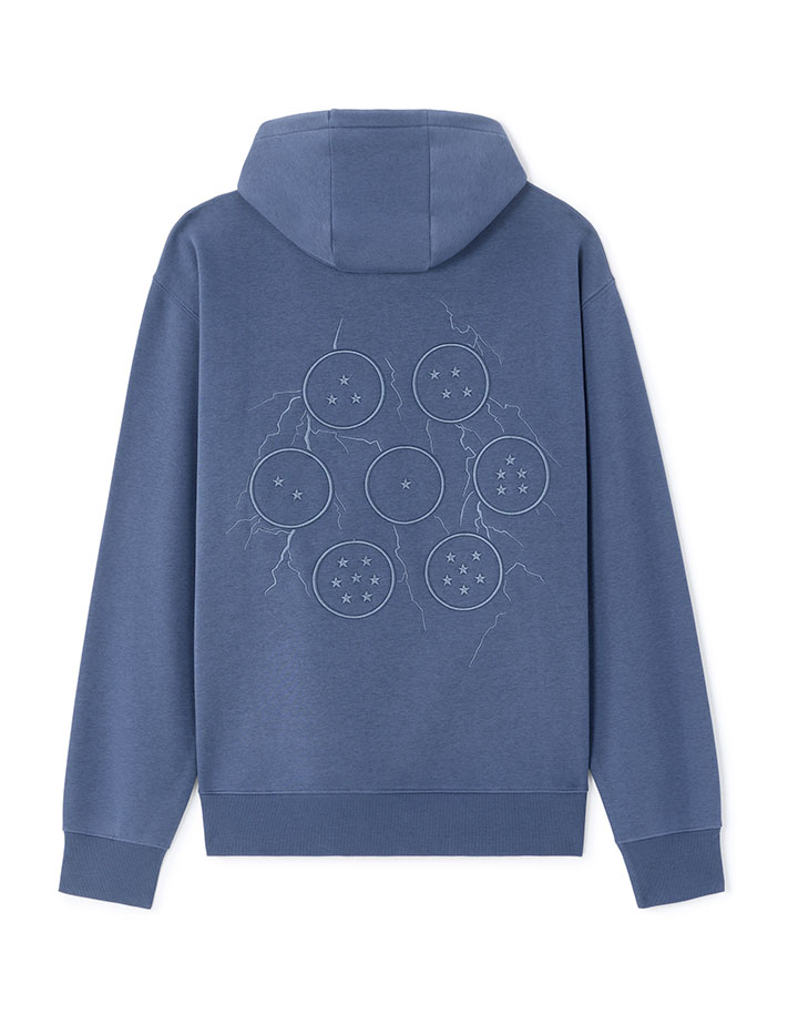 Ce sweatshirt bleu marine est habillé d’une broderie de la Boule à quatre étoiles au niveau du cœur. Les 7 Dragon Ball sont réunies à l’arrière, prêtes à invoquer Shenron, dont l’apparition semble se rapprocher, à en croire les éclairs qui occupent le dos du vêtement…
