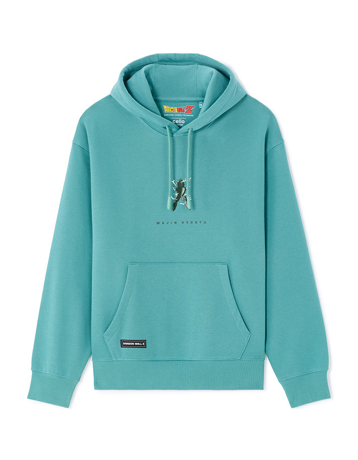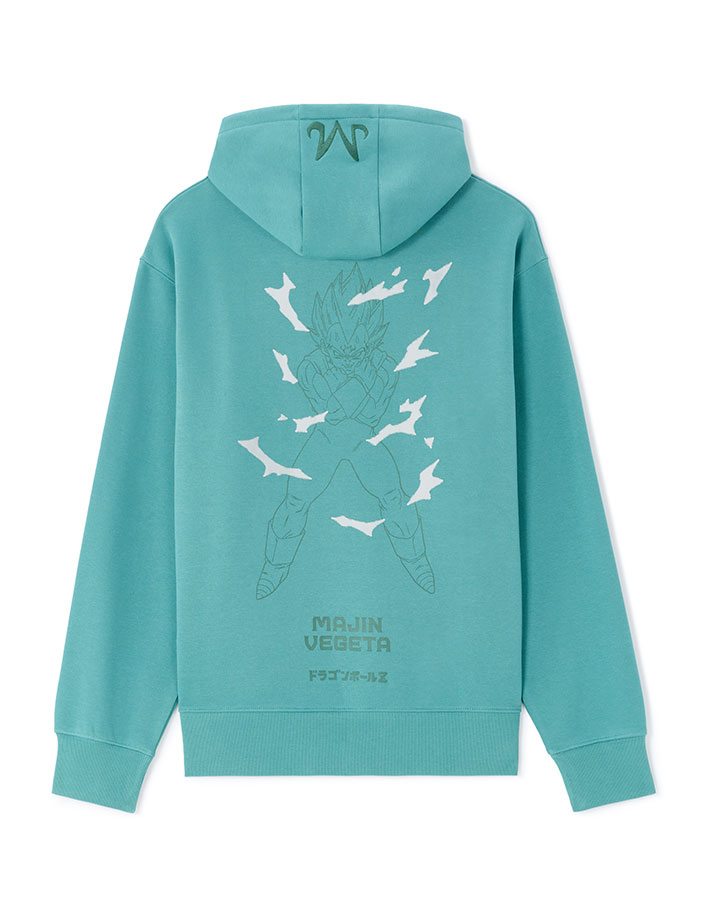 Une des transformations les plus populaires de Dragon Ball prend place sur ce sweatshirt vert. Sa silhouette et l’inscription « Majin Végéta » sont à l’avant, tandis qu’à l’arrière, on retrouve une illustration de Végéta dans toute sa splendeur. Le logo des Majin est également brodé au bout de la capuche.