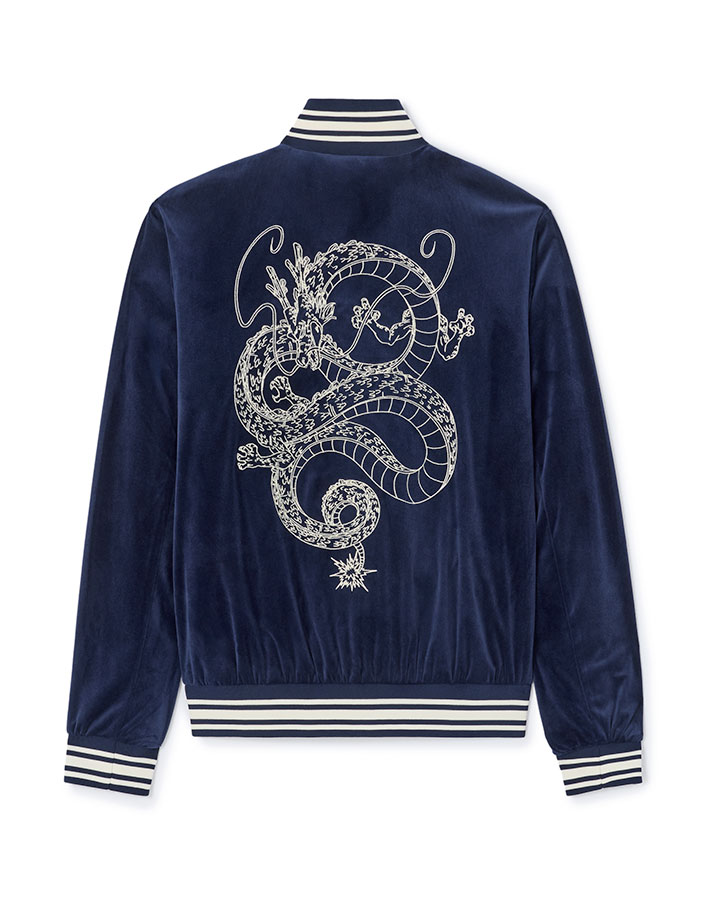 Une veste (79,99€) et un pantalon (49,99€) en velours bleu composent un ensemble de sport chic, décorés de Shenron et ses 7 Dragon Ball ! La veste est décorée de lignes blanches et des 7 Dragon Ball sur les manches, ainsi que d’une magnifique illustration de Shenron dans le dos. Le pantalon qui va avec quant à lui est décoré des 7 Dragon Ball sur la jambe gauche.
