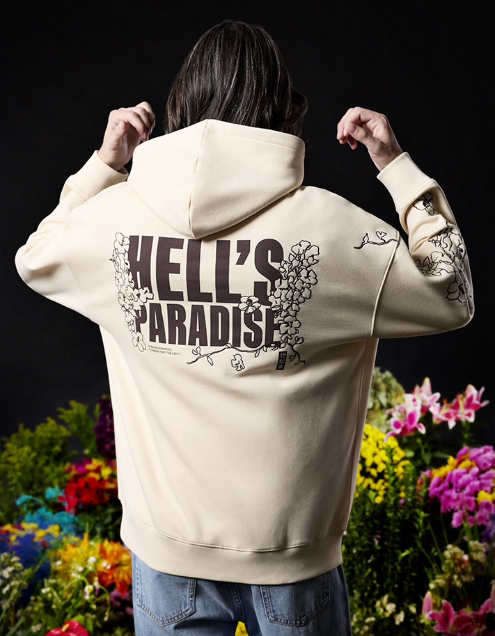 Des fleurs brodées décorent ce sweatshirt à capuche beige, rappelant les morts sur Shinsekyo qui se retrouvent recouverts de végétation. L’inscription « Hell’s Paradise » habille le dos de la pièce, accompagnée de la citation « Even in Darkness, Flowers find the Light. »
