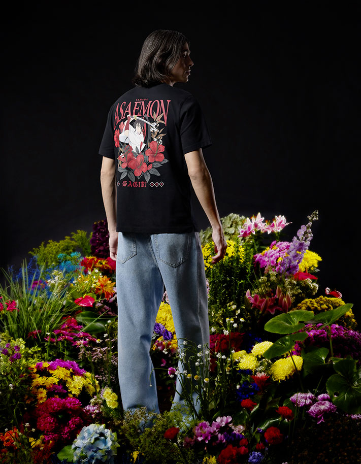 La famille de bourreaux Yamada Asaemon est représentée sur ce T-shirt noir, à l’aide d’une illustration de Sagiri au dos de la pièce. Elle est accompagnée de l’inscription « ASAEMON » d’un rouge qu’on retrouve sur les fleurs qui complètent l’illustration. À l’avant, le katana des Asaemon et des fleurs sont situés au niveau du cœur.