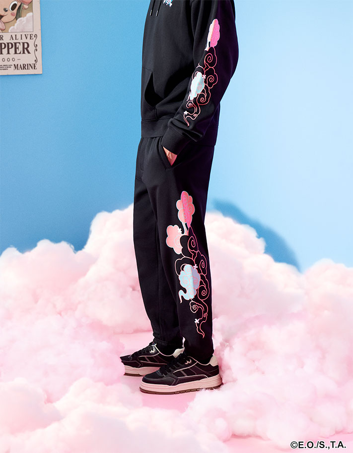 Composé d’un pantalon et d’un sweat à capuche noir, cet ensemble de jogging est décoré de nuages roses et bleus sur les manches et les jambes.
