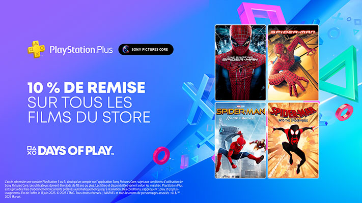 Ne manquez pas les offres sur les films PlayStation Productions lors des Days of Play sur Sony Pictures Core ! De plus, les abonnés PlayStation Plus peuvent profiter de 10 % de remise sur tout le catalogue Sony Pictures Core, ainsi que de remises doublées lors de ventes flash à durée limitée qui auront lieu régulièrement du 28 mai au 11 juin, notamment des films de super-héros et plus encore.
