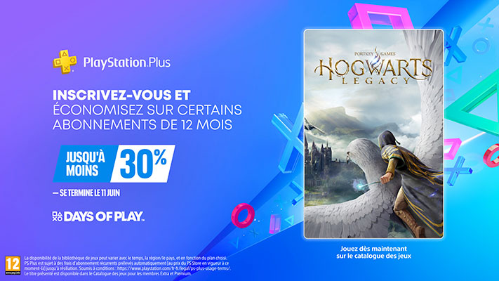 Cette année, lors des Days of Play, économisez sur un nouvel abonnement ou sur une mise à niveau de PlayStation Plus. Les joueurs qui rejoindront PlayStation Plus lors des célébrations de cette année pourront économiser jusqu’à 30 % sur certains abonnements de 12 mois. Les joueurs actuellement abonnés à PlayStation Plus Essential ou Extra pourront économiser 30 % sur la durée restante de leur abonnement en optant pour PlayStation Plus Premium/Deluxe.