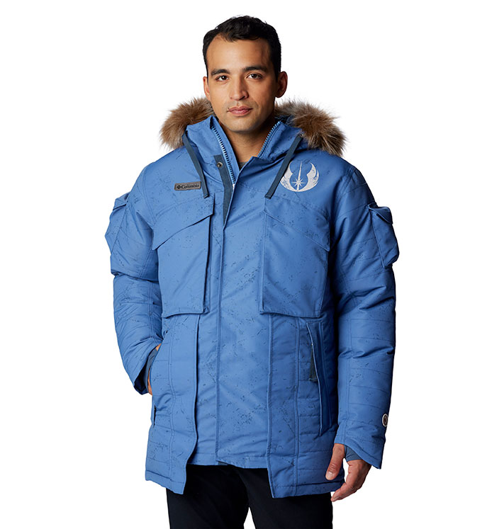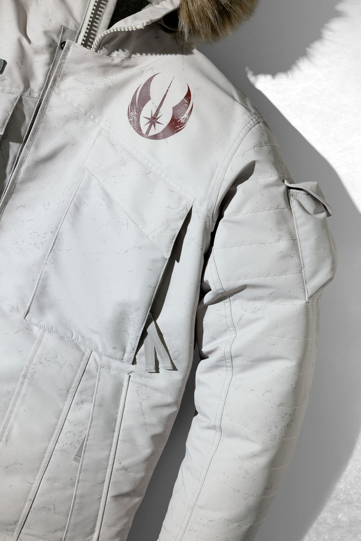 Republic parka (500€) s’inspire d’Obi-Wan Kenobi et d’Anakin Skywalker et de leurs aventures sur la planète de glace Orto Plutonia. Deux parkas sont disponibles (bleue pour les fans d’Anakin et grise pour les adeptes d’Obi-Wan), et vous garderont au sec et protégé tandis que l’isolation 650-fill et la doublure infinie Omni-Heat font équipe contre le froid. Les détails préférés des fans incluent les insignes des Jedi et de la République, ainsi qu’une étiquette interne « blood chit » codée en Aurebesh, le langage écrit universel de la galaxie Star Wars. Les caractéristiques supplémentaires comprennent des poches de sécurité, des poches pour les mains, des poches poitrine et des poches cargo, ainsi que des poignets confortables et une capuche (avec fausse fourrure amovible) et un ourlet réglables.