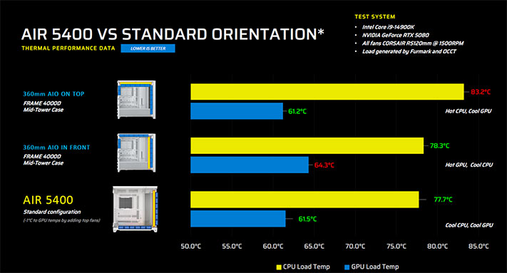 L’AIR 5400 améliore l’efficacité du refroidissement grâce à une chambre dédiée au processeur située à l’avant du boîtier. Cette chambre frontale est conçue pour un AIO de 360 mm, qui aspire de l’air frais depuis l’extérieur du boîtier vers le radiateur et évacue immédiatement l’air chaud généré grâce à une sortie d’air sculptée, tout en maintenant les chambres isolées les unes des autres. Cette conception permet de refroidir le processeur de manière indépendante de la carte graphique, offrant des performances de refroidissement supérieures à celles des AIO montés sur le dessus.