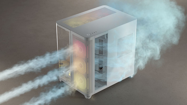 Disponible en noir ou en blanc, l’AIR 5400 est livré avec 3 ventilateurs à rotor inversé RS120-R PWM ARGB ou 3 ventilateurs iCUE LINK LX120-R. Dans les deux modèles, les ventilateurs d’admission sont préinstallés en bas du boîtier pour diriger l’air frais vers la carte graphique. La version LX120-R comprend un hub système iCUE LINK pour permettre la connexion d’appareils iCUE LINK supplémentaires.