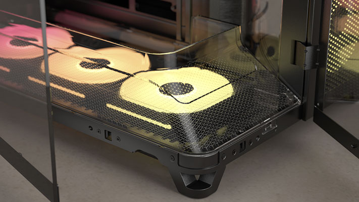 Un panneau d’E/S moderne situé sur le dessus comprend trois ports USB Type-C : deux à 5 Gb/s et un à 10 Gb/s pour des transferts de fichiers rapides, ainsi qu’une prise microphone/casque et un bouton d’alimentation. Le boîtier comprend également un bras de stabilisation anti-affaissement intégré, une boîte de rangement réutilisable pour les vis du boîtier, des vis QuikTurn® pour faciliter et accélérer l’installation des ventilateurs, ainsi qu’un chiffon en microfibre pour garder les panneaux en verre parfaitement propres.