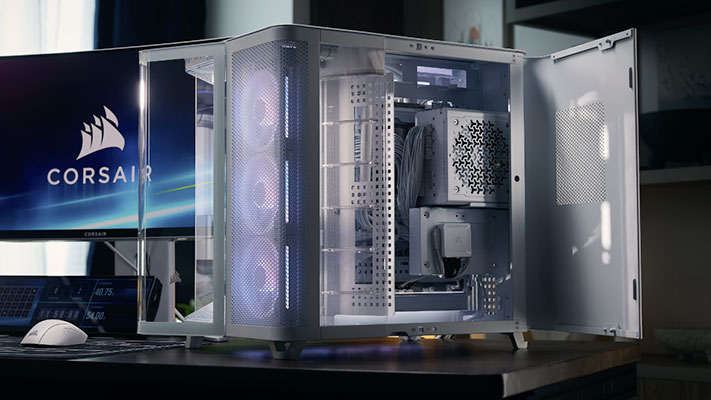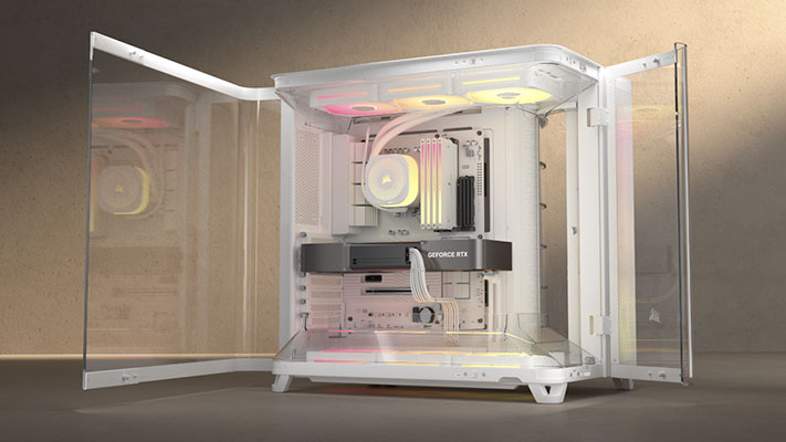 Ce boîtier PC unique et innovant isole les composants les plus chauds dans des zones de refroidissement distinctes, réduisant ainsi la chaleur et le bruit des ventilateurs tout en améliorant les performances. Grâce à ses deux conduits d’air dans la chambre principale, à son design en verre intégral avec portes à ouverture latérale, à ses ventilateurs RGB préinstallés à rotation inversée et à sa large chambre pour processeur offrant une excellente évacuation de la chaleur, l’AIR 5400 établit de nouveaux standards en matière d’innovation et de performance thermique. Tout comme CORSAIR avait démocratisé les boîtiers à double chambre en 2013 avec le tout premier AIR 540, la marque s’apprête une fois encore à bousculer le statu quo du marché des boîtiers PC avec une solution encore plus aboutie et élégante sur le plan fonctionnel.