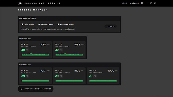 Le CORSAIR ONE a600 utilise le logiciel CORSAIR Dashboard, offrant une surveillance et un contrôle intuitifs du système. Les utilisateurs peuvent choisir entre les préréglages thermiques Silencieux, Équilibré ou Avancé, le mode Avancé permettant une personnalisation complète du comportement de refroidissement pour un réglage précis des profils thermiques et des performances du ventilateur.