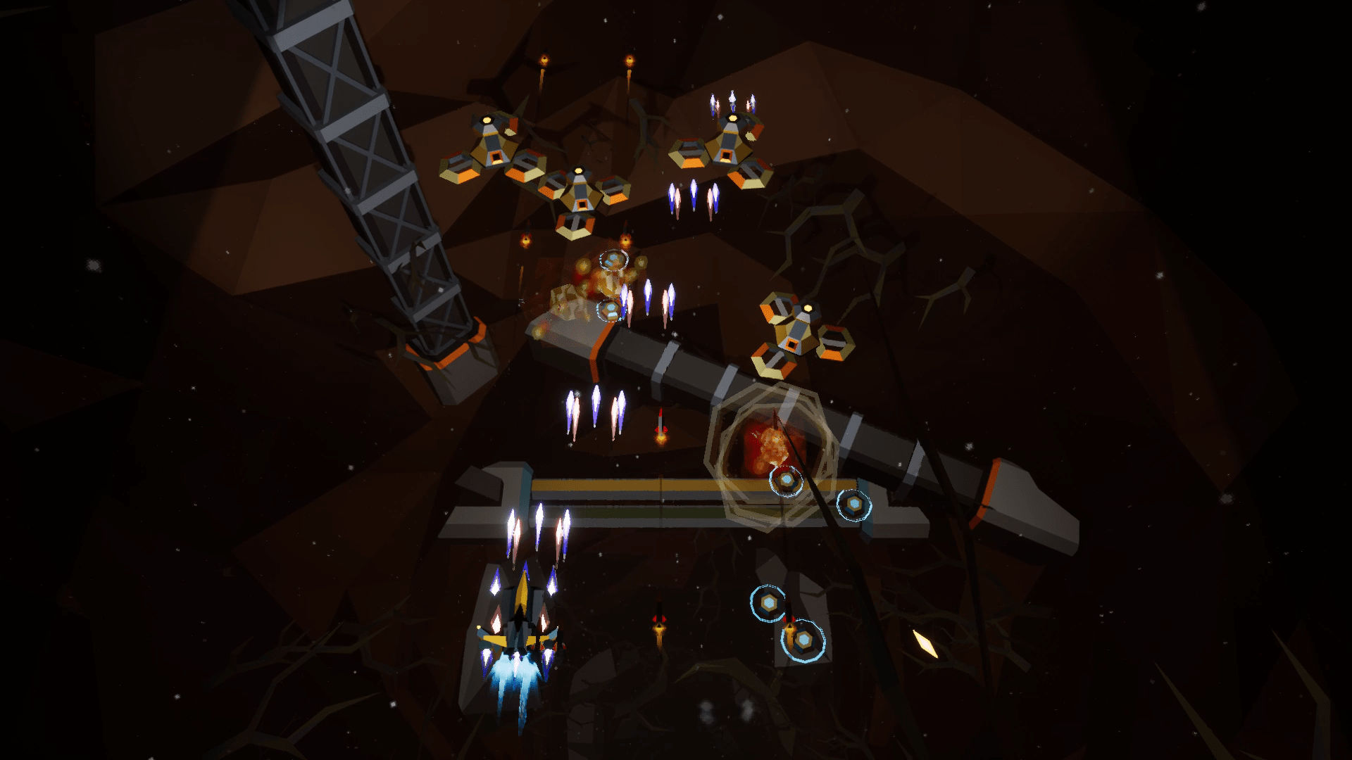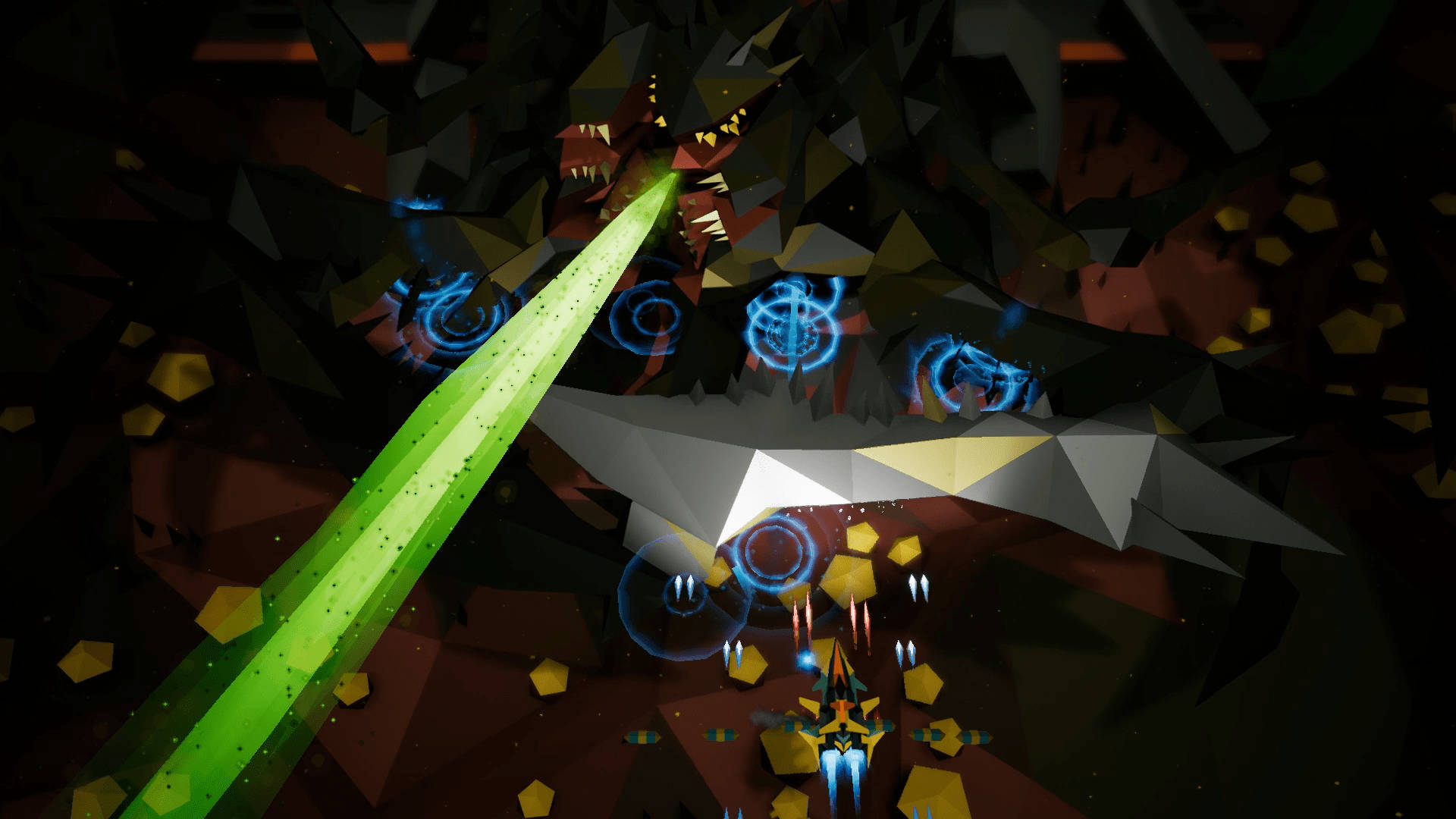 Dark Gravity est le nouveau jeu de tir de type shmup se démarquant par son niveau de difficulté élevé, de nombreux travaux d’artisanat possibilités et des graphismes low poly uniques. Le jeu fera allusion aux classiques du Danmaku japonais comme Radiant Silvergun ou Ikaruga.