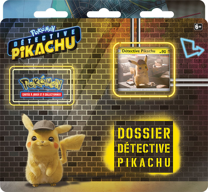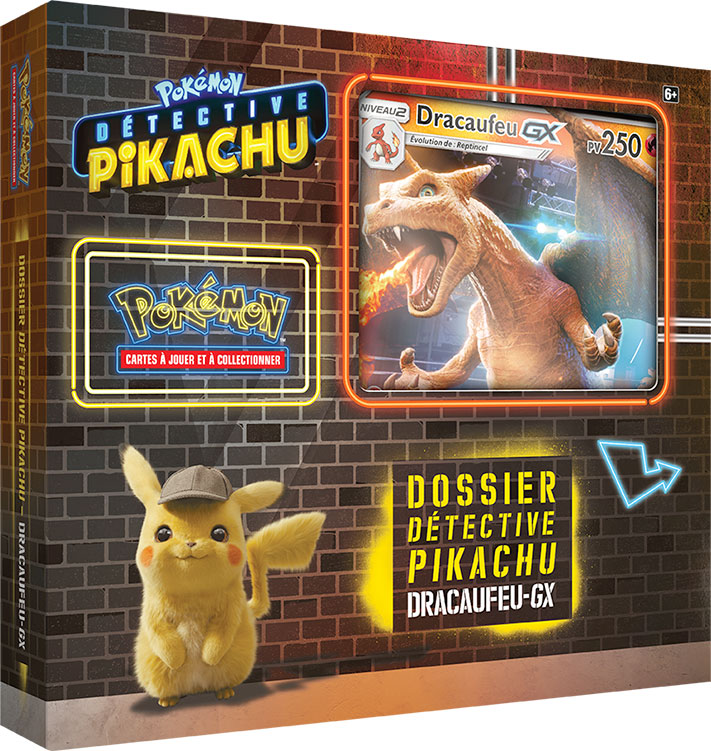 Le Dossier Détective Pikachu du JCC Pokémon contient une carte promo de Détective Pikachu, une pièce métallisée s’inspirant de Détective Pikachu, deux boosters de Détective Pikachu et un booster supplémentaire du JCC Pokémon.- Le Dossier Détective Pikachu – Dracaufeu-GX du JCC Pokémon contient une carte promo brillante et une carte grand format brillante de Dracaufeu-GX, quatre boosters de Détective Pikachu et deux boosters supplémentaires du JCC Pokémon.