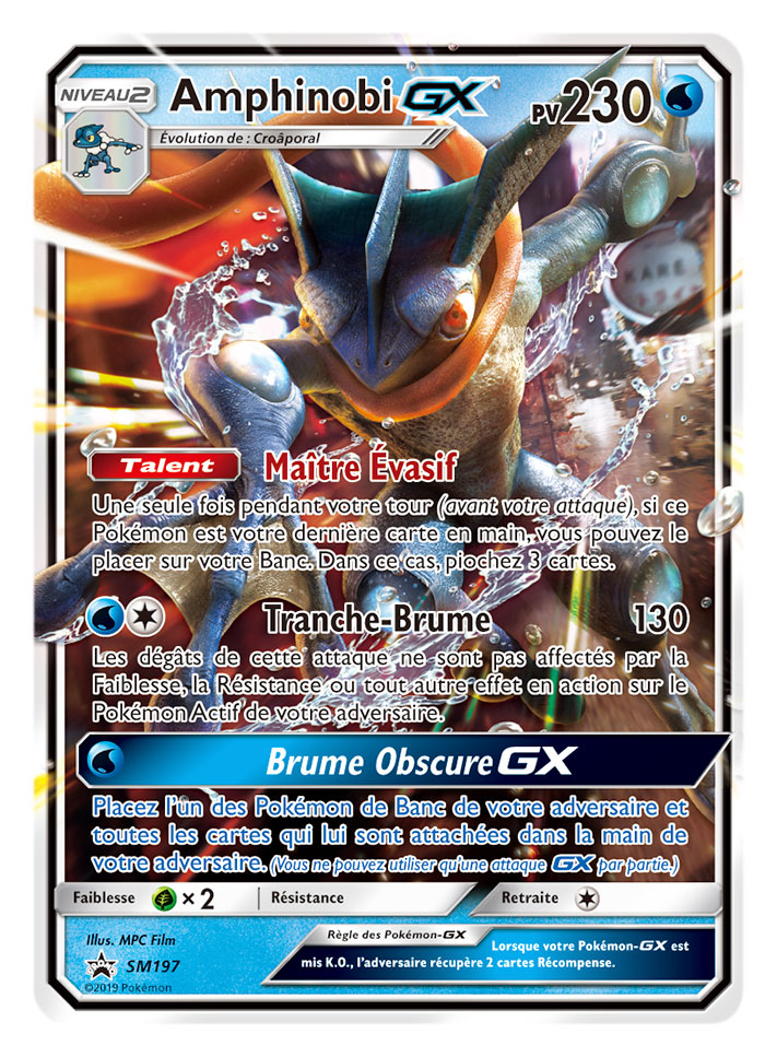 - Le Dossier Détective Pikachu – Amphinobi-GX du JCC Pokémon contient une carte promo brillante et une carte grand format brillante d’Amphinobi-GX, un pin’s d’Amphinobi, cinq boosters de Détective Pikachu et deux boosters supplémentaires du JCC Pokémon.