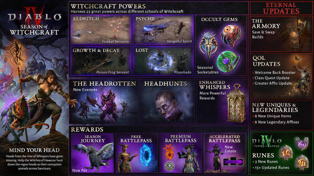 • RÉCOMPENSES SAISONNIÈRES : De nouveaux objets uniques et légendaires arrivent avec la saison des maléfices. Les personnages possédant Vessel of Hatred pourront profiter de trois nouvelles runes et de nombreuses modifications apportées aux runes existantes. Des récompenses exclusives seront disponibles en obtenant les faveurs de la Cabale et en progressant dans le passe de combat et le périple saisonnier, notamment un familier corbeau.