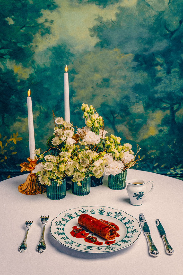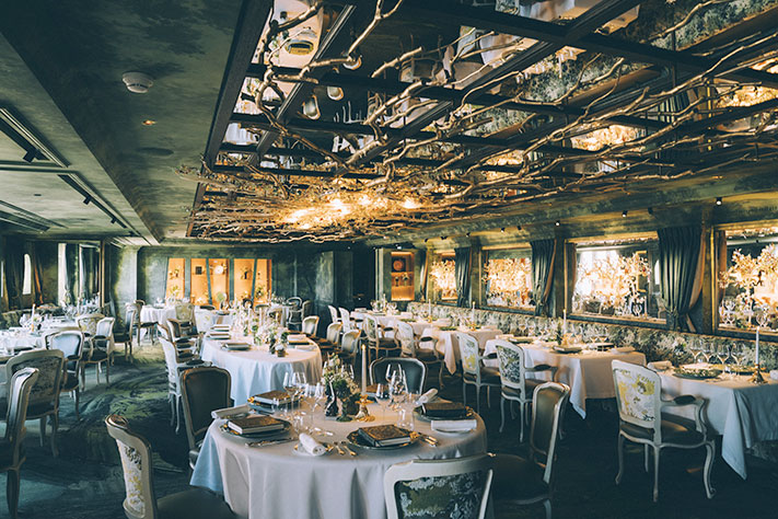 Au sein de La Forêt Secrète par Jean Imbert, la créativité s’exprime dans l’assiette comme dans la scénographie où chaque détail est au service de l’immersion. A l’image de ce lustre Murano majestueux, orné de feuillages et d’oiseaux, qui surplombe la table d’hôte centrale, diffusant une lumière chaleureuse. La fresque murale, entièrement réalisée à la main, illustre une forêt aux milles nuances de vert. La vaisselle signée par la Maison Bernardaud, aux motifs végétaux, spécialement créée pour le restaurant, ainsi qu’une sélection d’argenterie de la Maison Christofle, contribuent à faire vivre aux convives une expérience inoubliable.