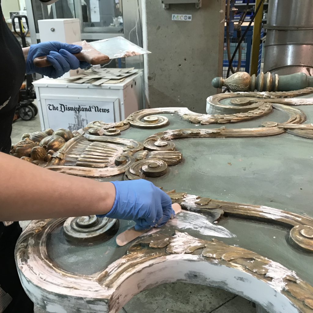 « Tous les objets et accessoires sur lesquels nous travaillons ont une vie qui leur est propre, certains étant présents sur les parcs depuis bientôt trente ans. Tous racontent une histoire » nous confie Eric, accessoiriste-réalisateur, mais également maître-verrier, et qui à ce titre est également chargé de la restauration de tous les vitraux des luminaires. « Il est important que nous respections cette histoire en travaillant de façon artisanale, pour obtenir un rendu le plus proche et le plus fidèle à l’objet d’origine, tout en prenant en compte l’évolution des normes de sécurité des techniques que nous utilisons ».