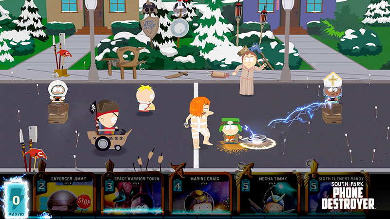 Dans South Park : Phone Destroyer, les joueurs incarnent une nouvelle fois le rôle du « petit-nouveau » et font équipe avec les personnages de South Park dans un nouveau jeu avec des cowboys, des pirates, des cyborgs et même des dieux tout-puissants. Ils doivent créer leur équipe dans cette nouvelle aventure solo dotée d’une histoire originale. Avec du fun omniprésent, des batailles explosives et l’humour mémorable de South Park, South Park : Phone Destroyer propose aux joueurs de construire et faire évoluer leur équipe pour contrôler la véritable force des cartes qu’ils acquièrent.