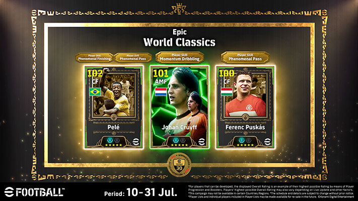Pelé débarque dans eFootball en tant que « Épique : Pelé », avec un design de carte spécial sur le thème du 30ème anniversaire. Il devient le premier joueur de la série à posséder deux nouvelles compétences : « Phenomenal Finish » et « Phenomenal Pass ». Il rejoint les footballeurs de légende Johan Cruyff et Ferenc Puskás, offrant aux joueurs l’opportunité de construire leur Équipe de rêve à partir de certains des noms les plus emblématiques du sport.