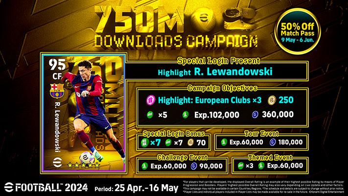 En complément, par le biais des Succès de Campagne, les utilisateurs pourront développer leurs ressources avec un gain potentiel de 360000 GP, 250 pièces eFootball, 102000 Exp, 5 programmes de compétence et 3 Accords chanceux En vedette : Clubs européens.