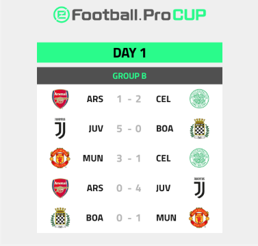 Après une première journée passionnante pour l’eFootball.Pro Cup, la Juventus, Manchester United et le FC Bayern Munich entameront la seconde journée de la phase de groupes en étant invaincus. Le FC Nantes est le seul club du Groupe A a n’avoir gagné aucun de ses matchs, et ne pourra donc pas se qualifier pour les phases éliminatoires. Dans le Groupe B, l’Arsenal FC et le Boavista FC, qui n’ont aucun point, sont en bas du classement et ont de moins bonnes chances de poursuivre la compétition après la seconde journée.