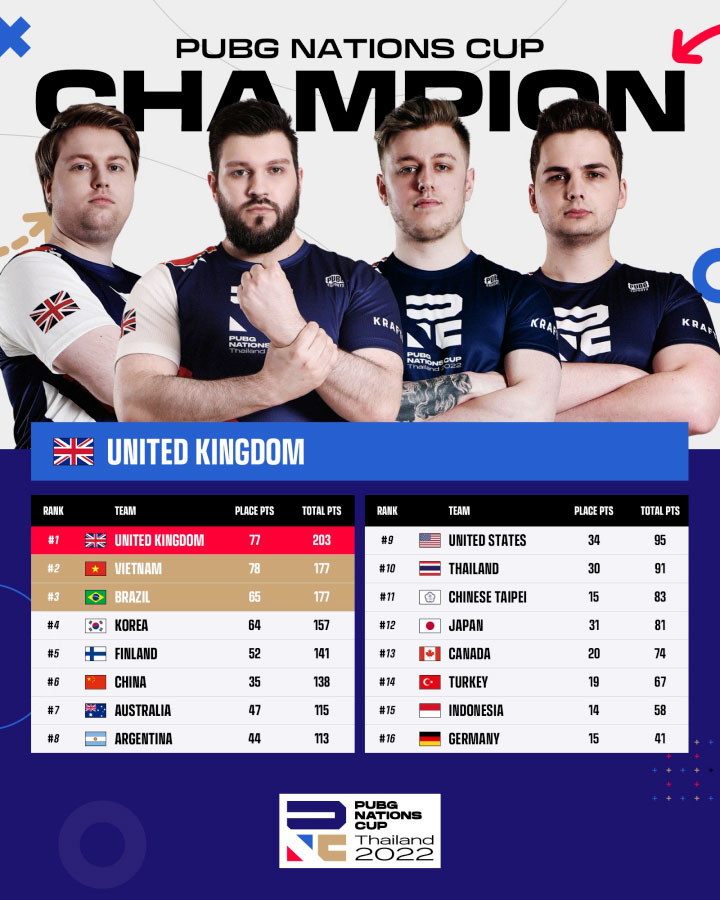 Dimanche 19 juin, l’équipe du Royaume-Uni a battu 15 autres rosters pour être couronnée championne de la PUBG Nations Cup 2022 à l’ICONSIAM de Bangkok, en Thaïlande.