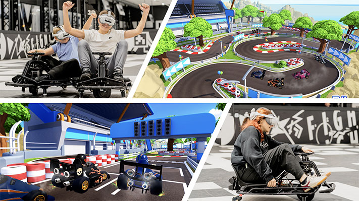 EVA a mis tout son savoir-faire en hyper free roaming VR (déplacement libre en grand espace) pour imaginer cette toute nouvelle expérience unique au monde. Les karts électriques se déplacent physiquement dans l’arène de 500m2 et sont connectés au jeu permettant ainsi au joueur d’être en immersion totale tout en ressentant pleinement les sensations de conduite.
