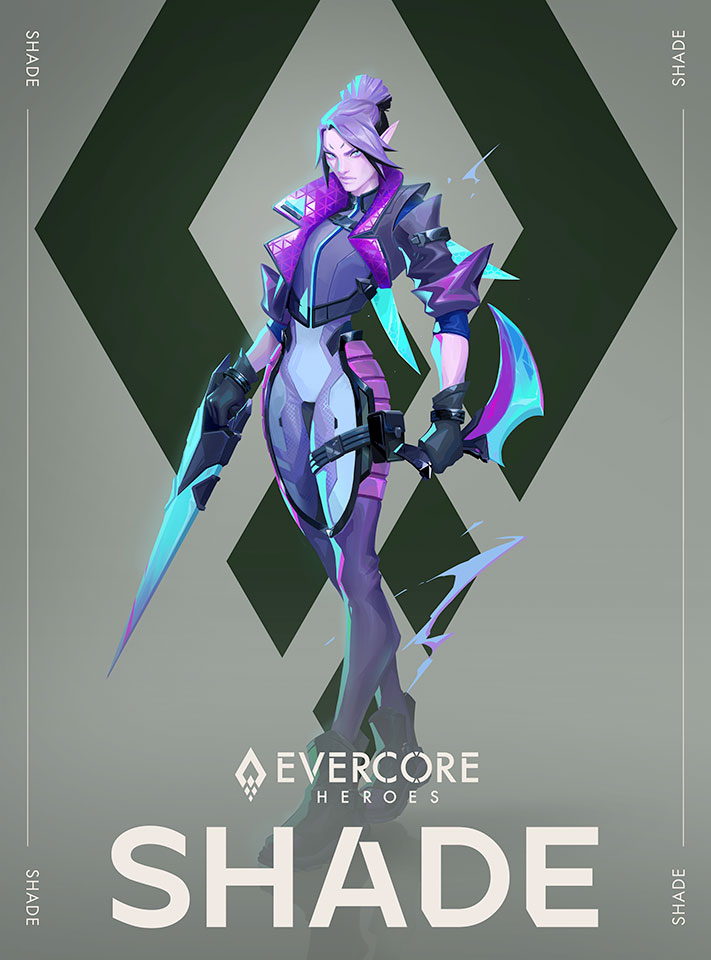 - Shade : Shade est un maître assassin : elle a consacré sa vie à sa profession. Pendant le combat, Shade virevolte, lacère ses ennemis, élimine ses cibles, et s’échappe ensuite au plus vite.