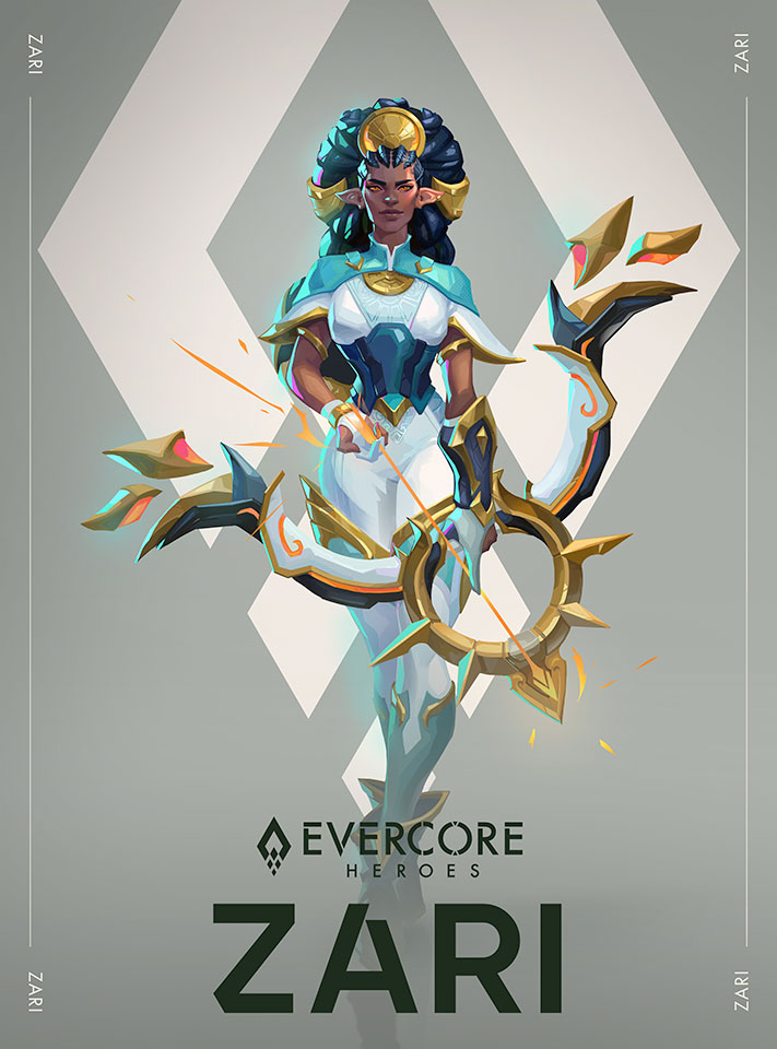 - Zari : Zari est la créatrice du Tir à l’arc solaire. Ayant enseigné son art de combat emblématique aux légions de guerriers les plus habiles d’Hydris, Zari combine ses capacités pour infliger des dégâts massifs et à distance à des cibles uniques et à de petits groupes d’ennemis.