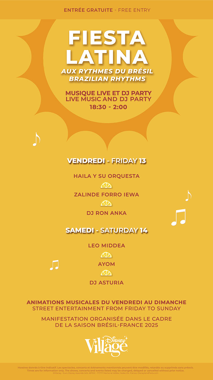 Disney Village vous invite à la nouvelle édition tant attendue de Fiesta Latina, une manifestation placée sous les couleurs du Brésil et organisée dans le cadre de la Saison Brésil-France 2025.