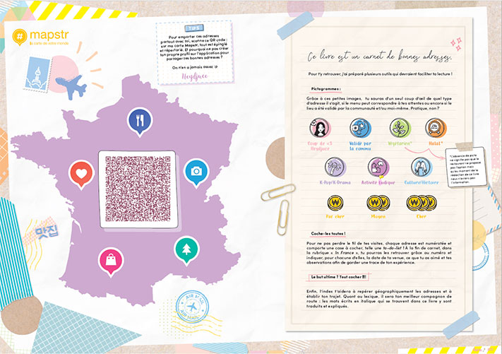 Pour une expérience encore plus immersive, anecdotes, QR codes, surprises et plan interactif sont proposés tout au long de l’ouvrage, sur fond de références K-Pop.