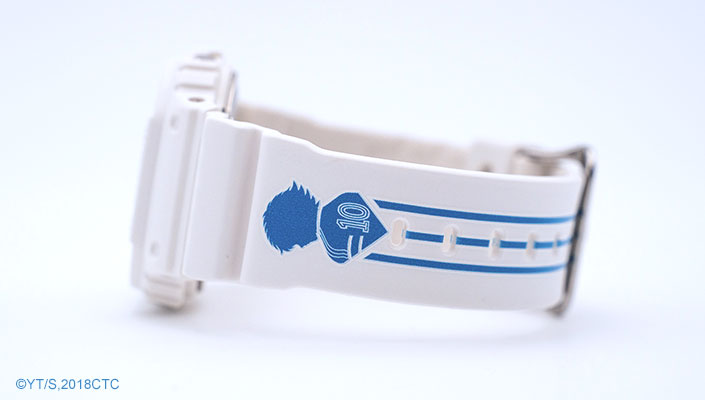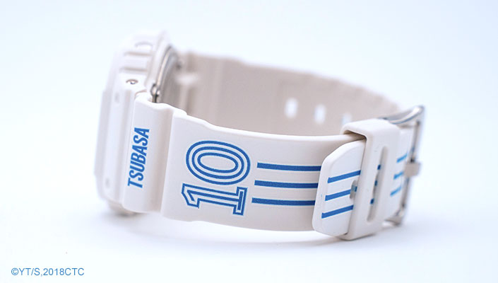 G-SHOCK revisite pour l’occasion son modèle Original DW-5600 aux couleurs de l’équipe de Captain Tsubasa, une montre iconique avec son célèbre boîtier carré. On retrouve sur une partie du bracelet en résine le portrait de Tsubasa et sur l’autre partie le numéro 10, numéro emblématique du joueur et surtout porté par de grandes stars du football, le tout relié par des bandes bleues aux couleurs de l’équipe. Le packaging sera lui aussi customisé avec le portrait de Tsubasa, le numéro 10 et le nom de l’équipe « Nankatsu » écrit en japonais.