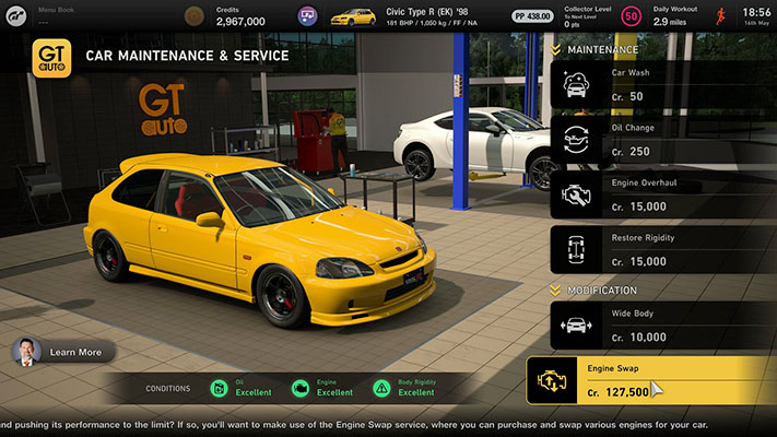 Il est désormais possible d’effectuer un remplacement de moteur via le menu Maintenance et service du GT Auto (niveau de collectionneur 50). Pour les véhicules concernés, ce service permet aux utilisateurs d’acheter et de s’équiper de nouveaux moteurs provenant de différentes voitures.