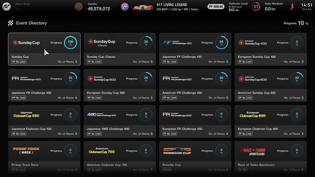 Le nouveau “Tableau de Bord” a été ajouté, un espace où les joueurs peuvent suivre de nombreuses et variées figures de progression, du nombre de voitures dans leur Garage à leur Niveau de Collectionneur ou leur taux de complétion des Circuits mondiaux. Le Tableau de Bord est disponible depuis le Menu GT en haut à gauche de l’écran, ou en appuyant sur le bouton “Triangle” depuis l’écran Carte du Monde.