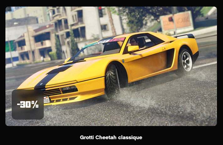 En plus des deux véhicules à prix réduit disponibles sur la piste d’essai, profitez de 30 % de réduction sur la Grotti Cheetah classique cette semaine.