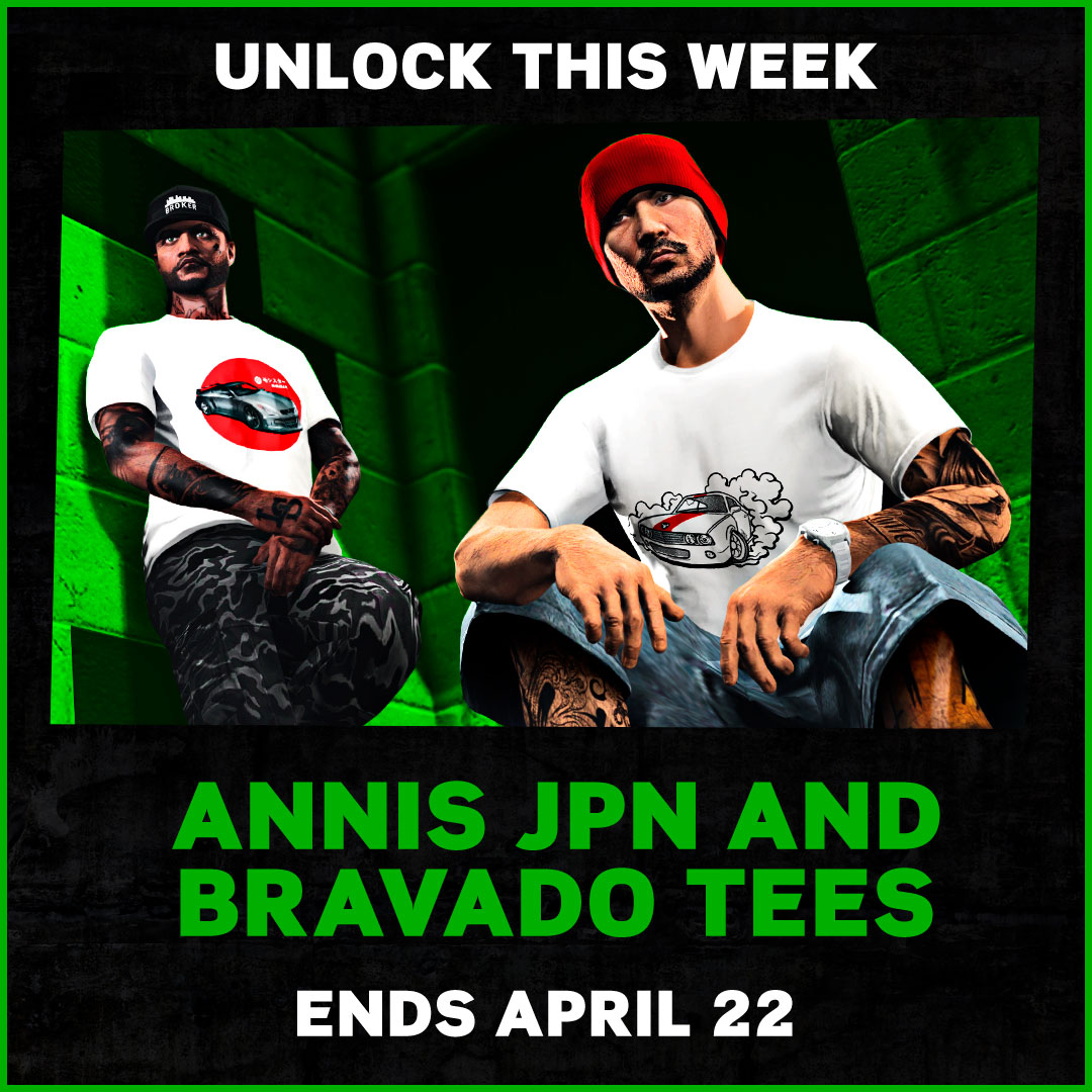 Jouez à GTA Online à tout moment cette semaine pour ajouter gratuitement à votre garde-robe la veste d’intérieur blanche à motif, ainsi que les t-shirts Bravado stylisé et Annis Japon.
