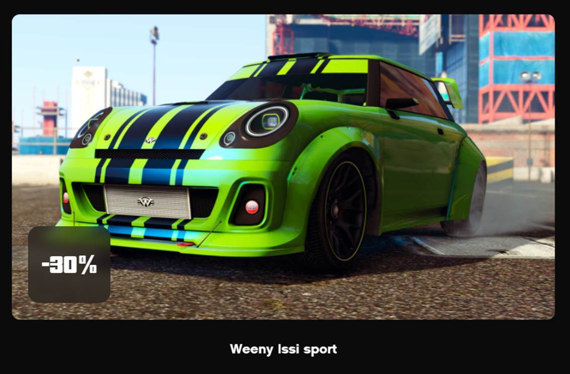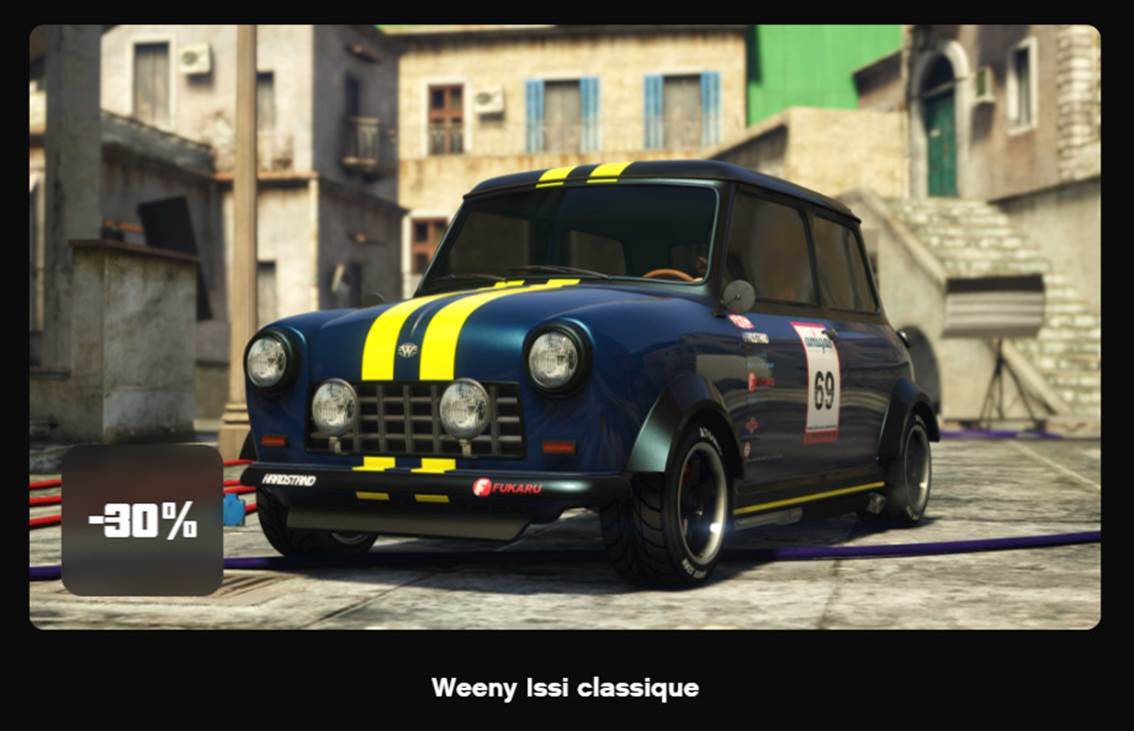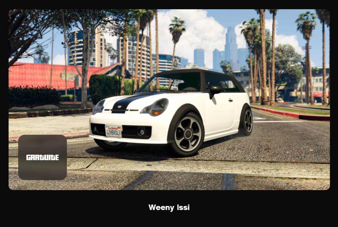 Cette semaine, tous les joueurs de GTA Online peuvent recevoir gratuitement une Weeny Issi depuis le site web de Southern San Andreas Super Autos. Des promotions sont également disponibles sur les autres modèles d’Issi, ainsi que sur une gamme de véhicules plus grands et plus robustes.