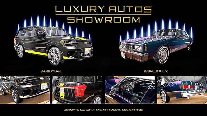 Faites un tour au showroom de Luxury Autos pour jeter un coup d’œil aux superbes véhicules à quatre places de la semaine : le Vapid Aleutian (SUV) et la Declasse Impaler LX (grosse cylindrée).