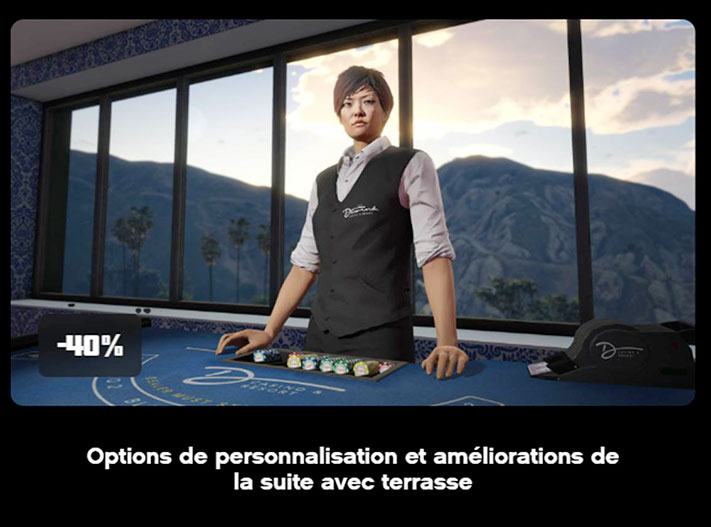 Cette semaine, achetez une salle d’arcade sur Maze Bank Foreclosures à -40 %. Cette remise s’applique aussi aux plans au sol, aux couleurs et aux motifs de votre suite avec terrasse, au sommet du casino.