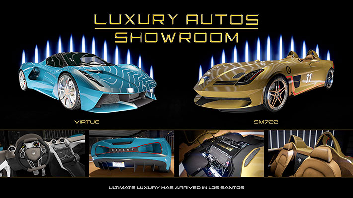 Faites un tour au showroom de Luxury Autos à Rockford Hills pour découvrir l’Ocelot Virtue (supersportive) et la Benefactor SM722 (sportive, à -30 %) dans la devanture, passer en revue leurs caractéristiques et faire vos achats directement sur place.