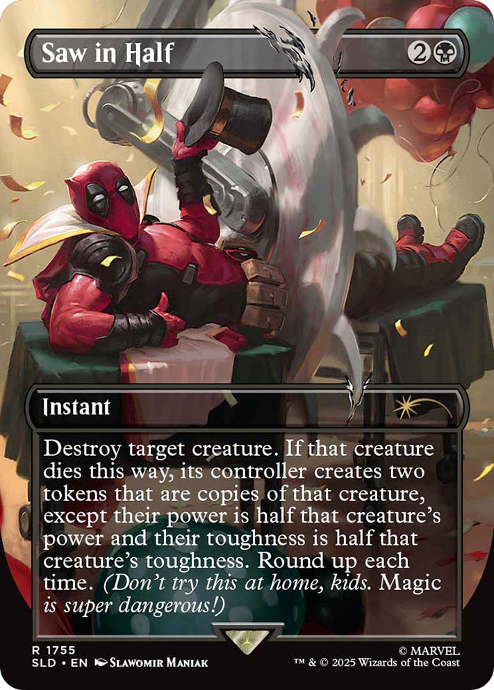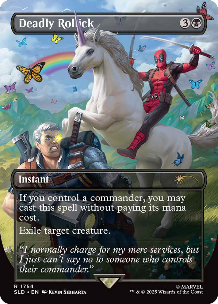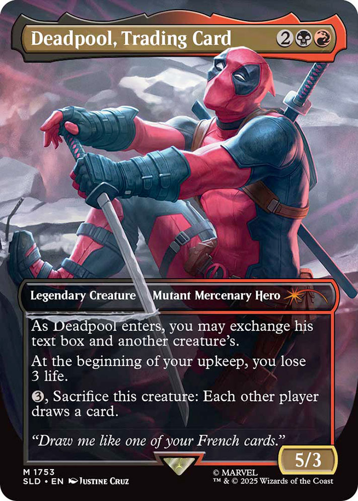 À l’occasion du 1er avril, le Mercenaire à grande bouche a brisé le quatrième mur de Secret Lair pour semer la pagaille dans son propre drop. À travers cinq cartes qui malmènent la continuité, notamment la carte intitulée « Deadpool, Trading Card », le dépravé qui se régénère se moque de tout ce qui nous est cher. Il est désormais possible de faire de cet anti héros pas comme les autres votre prochain commandant, à condition de le faire travailler en équipe.