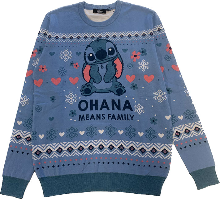 - Pull de Noël bleu Stitch « Ohana means family » – 29,90€ (Auchan, Legend Icon…)