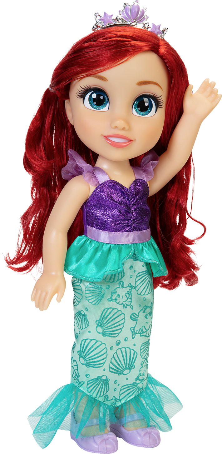En appuyant sur son collier coquillage, Ariel chantera 2 chansons : Sous l’Océan et Partir là-bas en version française. Sa queue de sirène s’illumine et est remplie de paillettes qui, en fonction du mouvement de la poupée, glissent comme une boule de Noël. La poupée Ariel peut entièrement aller sous l’eau et est donc idéale pour jouer dans le bain. Au contact de l’eau, elle peut chanter différentes chansons. 3 modes de jeu.